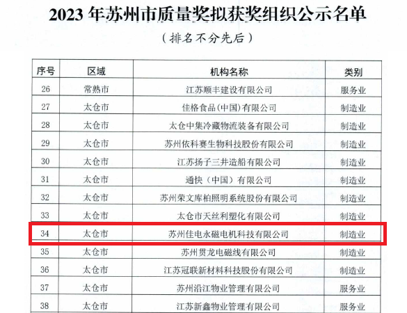 克日,苏州市质量奖评定委员会公示2023年苏州市质量奖评定效果,苏州yl23411永利官网永磁电机科技有限公司(以下简称“苏州yl23411永利官网”)依附着在战略妄想、焦点手艺构建、谋划理念、质量系统等方面的优异体现,经由层层严酷评审,获得了质量评定委员会的高度认可,获评“苏州市质量奖”声誉称呼。