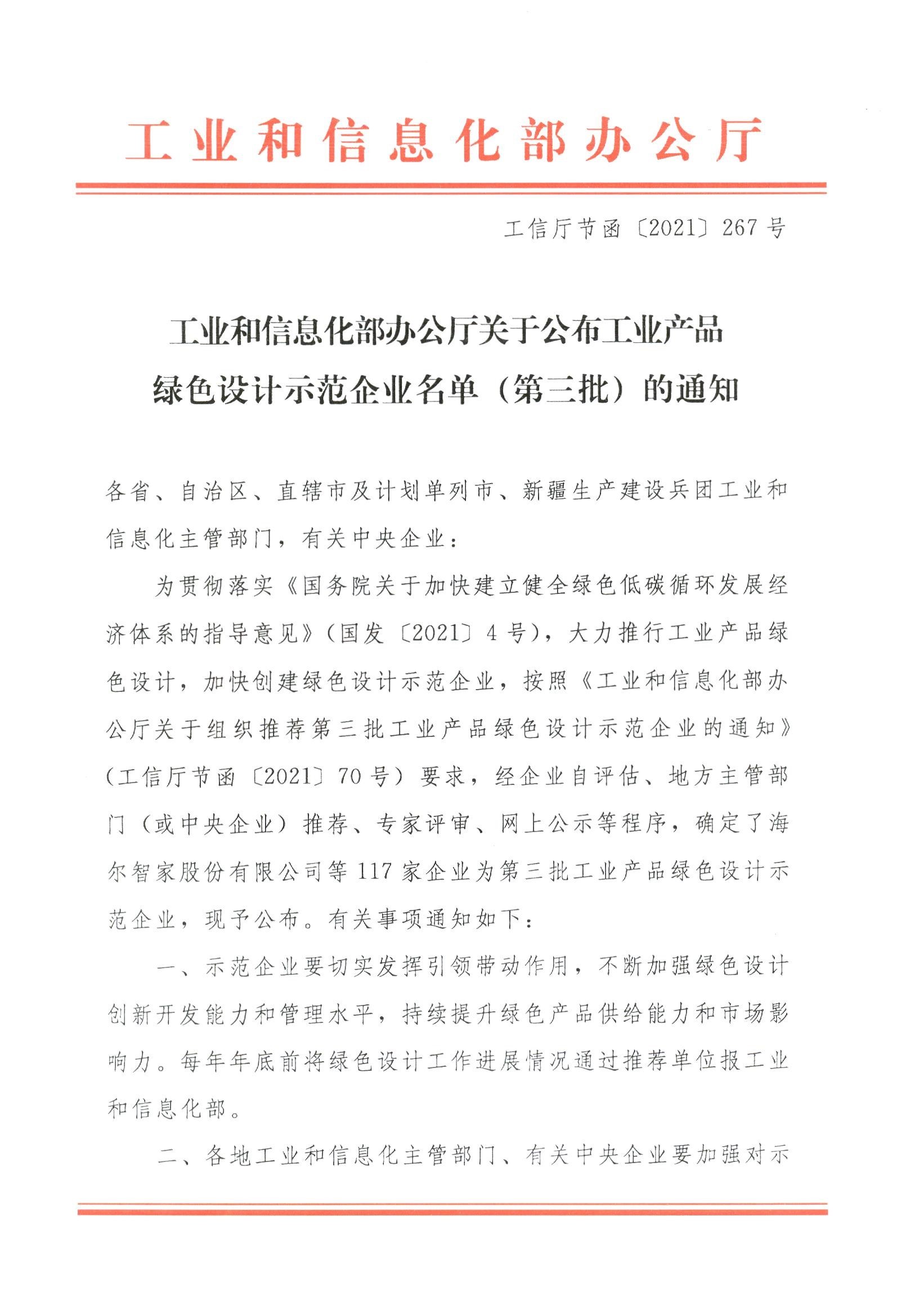 yl23411永利官网股份起劲强化绿色设计立异开发能力和管理水平,一连提升绿色产品供应能力和市场影响力,于2021年11月,被国家工业和信息化部评为国家级“绿色产品设计树模企业”,成为黑龙江省唯逐一家入选第三批工业产品绿色设计树模企业。